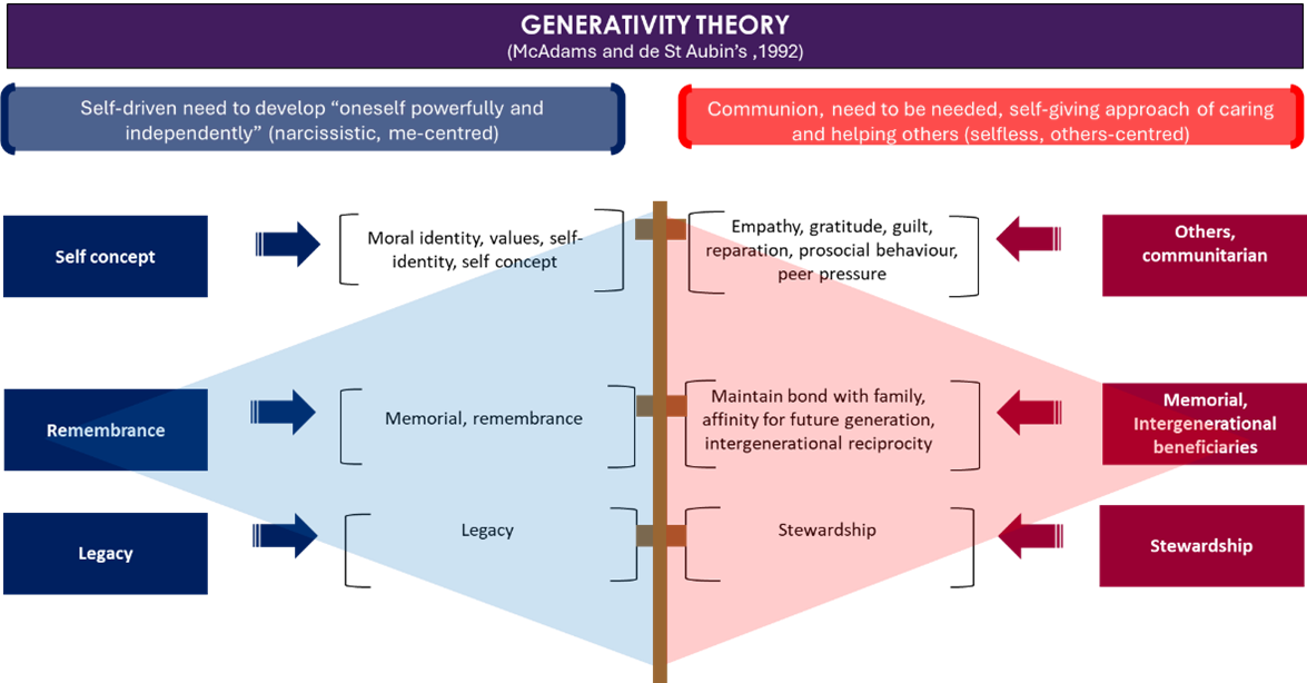 Applying the generativity theory to charitable bequest, we need to further understand two dimensions within the inner desire of seeking symbolic immortality through a self-driven need to develop “oneself powerfully and independently”, vs. a communion, need to be needed, self-giving approach of caring and helping others. Regardless of intentions, the characteristics of legacies are paradoxical; it requires one to be narcissistic to create a bequest that reflects one’s self-preservation, yet its outcome is centred on others, in providing aid and help (Rubinstein, 1996, p. 59) like a selfish heart, made pure. See schematic -Figure 1.