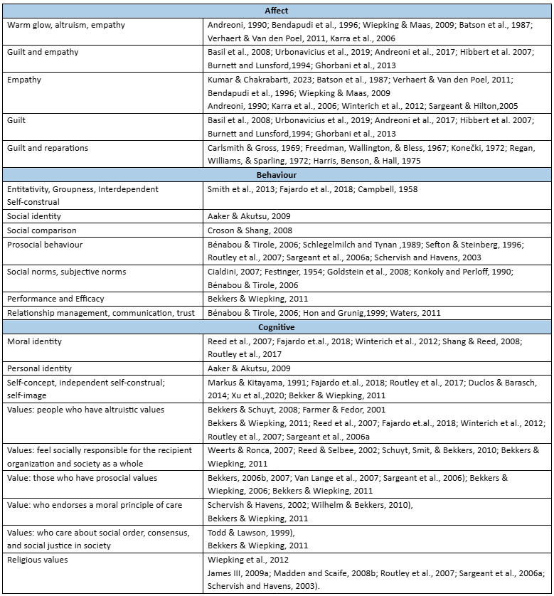 People seek consistency in their beliefs and actions, and these are demonstrated through the values they hold (Wiepking et al., 2012; Easwar and Kashyap, 2009; Routley et al., 2017 Reed et al., 2007; Fajardo et.al., 2018; Winterich et al., 2012). The values that drive charitable giving, include altruistic values (Bekkers & Schuyt, 2008; Farmer& Fedor, 2001; Bekkers & Wiepking, 2011; Reed et al., 2007; Fajardo et.al., 2018; Winterich et al., 2012; James III, 2009a; Madden and Scaife, 2008b; Routley et al., 2007; Sargeant et al., 2006a; Schervish and Havens, 2003); feel socially responsible and motivated to make the world a better place. (Weerts & Ronca, 2007; Amato,1985; Reed & Selbee, 2002; Schuyt, Smit, & Bekkers, 2010; Bekkers & Wiepking, 2011); prosocial values with less materialistic goals (Sargeant et al., 2000; Bekkers & Wiepking, 2006); adopt a moral principle of care (Schervish & Havens, 2002; Wilhelm & Bekkers, 2010, Bekkers & Wiepking, 2011); care about social order and social justice (Todd & Lawson, 1999; Bekkers & Wiepking, 2011); political and religious values (Wiekping et al. 2012; Bekkers & Wiepking, 2011).